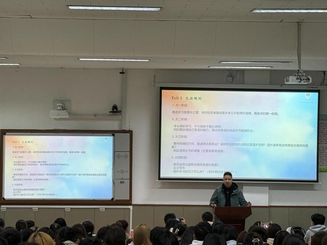 分享会上,刘一楠以自身求学经历为切入点,系统拆解了中德四年的学习脉络:大一作为德语学习的基础阶段至关重要;大二阶段进入专业课学习,分为中方课程与德方课程,需在适应德语教学环境的同时,兼顾英语学习,避免语言能力退化;大三是明确发展方向的关键期,需确定考研或就业路径,尤其是留学所需的雅思成绩,需尽早规划备考;大四的德国交换学习,不仅要完成课程任务与德文论文,更要珍惜跨文化交流机会,全方位体验德国的教育与生活。