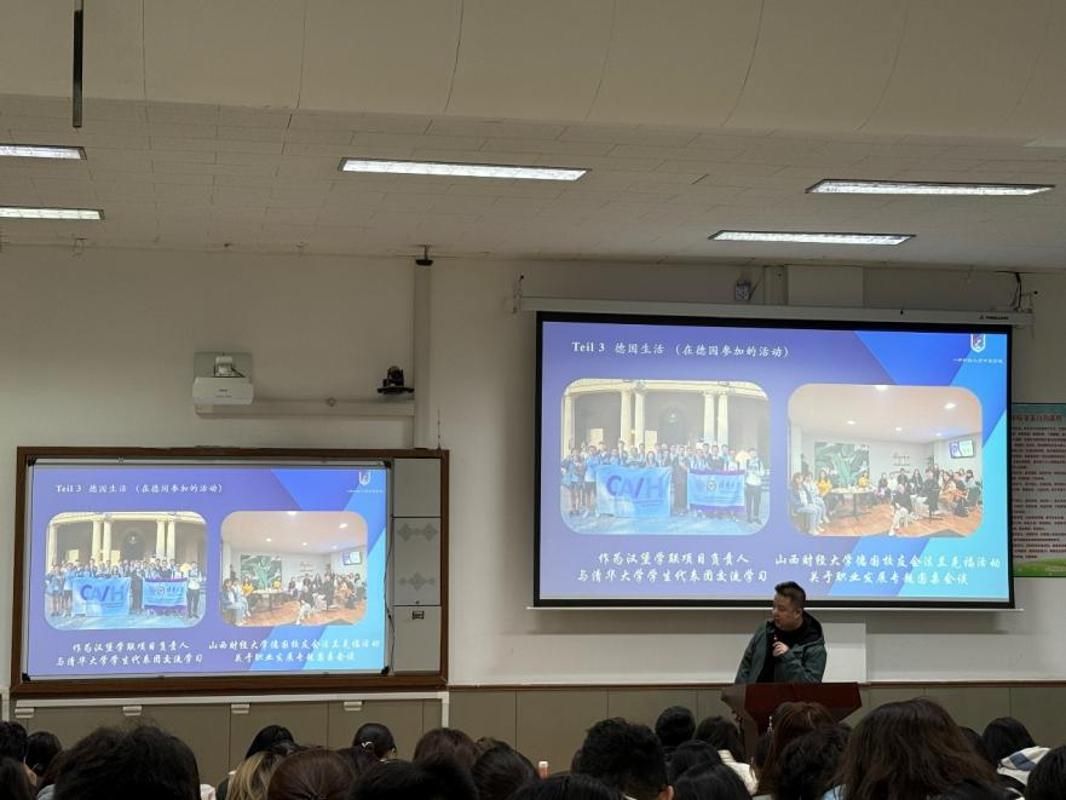 2022届毕业生、德国汉堡大学研究生刘一楠结合自身学习及德国留学经历,从课程学习、留学准备、海外生活等多个维度展开,他以“从汾水河畔到莱茵之滨:我们的中德四年与德国之路”为题为在场同学提供了全面且实用的指导。讲座现场座无虚席,互动氛围热烈浓厚,让在场师生受益匪浅,为同学们的学业规划与留学筹备点亮了前行的灯塔。