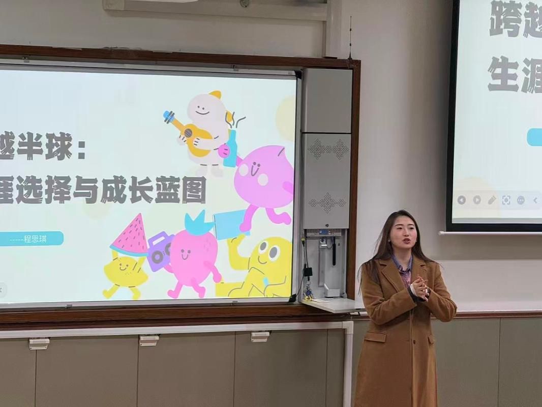 在热烈的氛围中,程思琪围绕留学申请规划、注意事项以及海外学习生活三个方面展开分享。关于留学规划,她建议同学们尽早明确目标院校与专业,深入研究申请要求,提前做好背景提升;在申请准备方面,她提醒大家合理规划语言考试时间,注重申请材料的完整性与规范性,并及时了解签证政策与留学费用,做到未雨绸缪。谈及海外生活,程思琪结合自身经历,讲述了初到布里斯托时在语言与文化方面遇到的挑战,鼓励同学们在专注学业、培养独立思考能力的同时,主动融入当地环境,积极适应异国生活节奏。